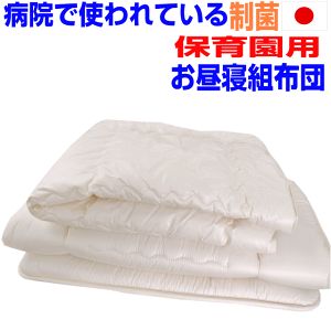 保育所お昼寝ふとんセット ほこりが出にくい中綿・清潔&安心 『非アレルギー・新機能素材』新企画!! 当店 寝具アドバイザーのプロデュースで誕生した 【ファイバー&高性能制菌】中綿使用オリジナルの布団です(^^)v 病院など医療機関などで広く使われている ファイバーの短繊維わたを使用し 家庭でも使えるようにお仕立てしました。