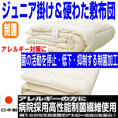 子供ジュニアサイズ用組布団 ほこりが出にくい中綿・清潔&安心 『非アレルギー・新機能素材』新企画!! 当店 寝具アドバイザーのプロデュースで誕生した 【ファイバー&高性能制菌】中綿使用オリジナルの布団です(^^)v 病院など医療機関などで広く使われている ファイバーの短繊維わたを使用し 家庭でも使えるようにお仕立てしました。